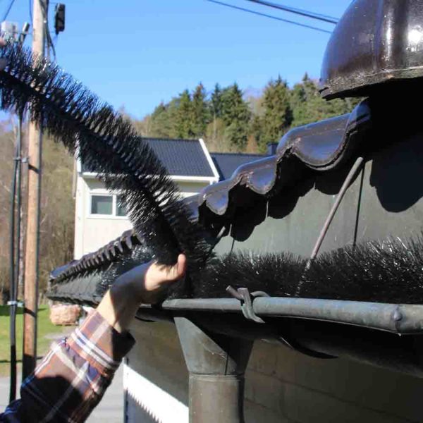 Legg ganske enkelt børsten ned i takrennen fra ende til ende. Hvis det er hjørner kan du bare bøye børsten slik at den passer takrennen. Hvis børsten er for lang for takrennen kan du ganske enkelt brette børsten bakover, slik at den ligger dobbelt på enden.