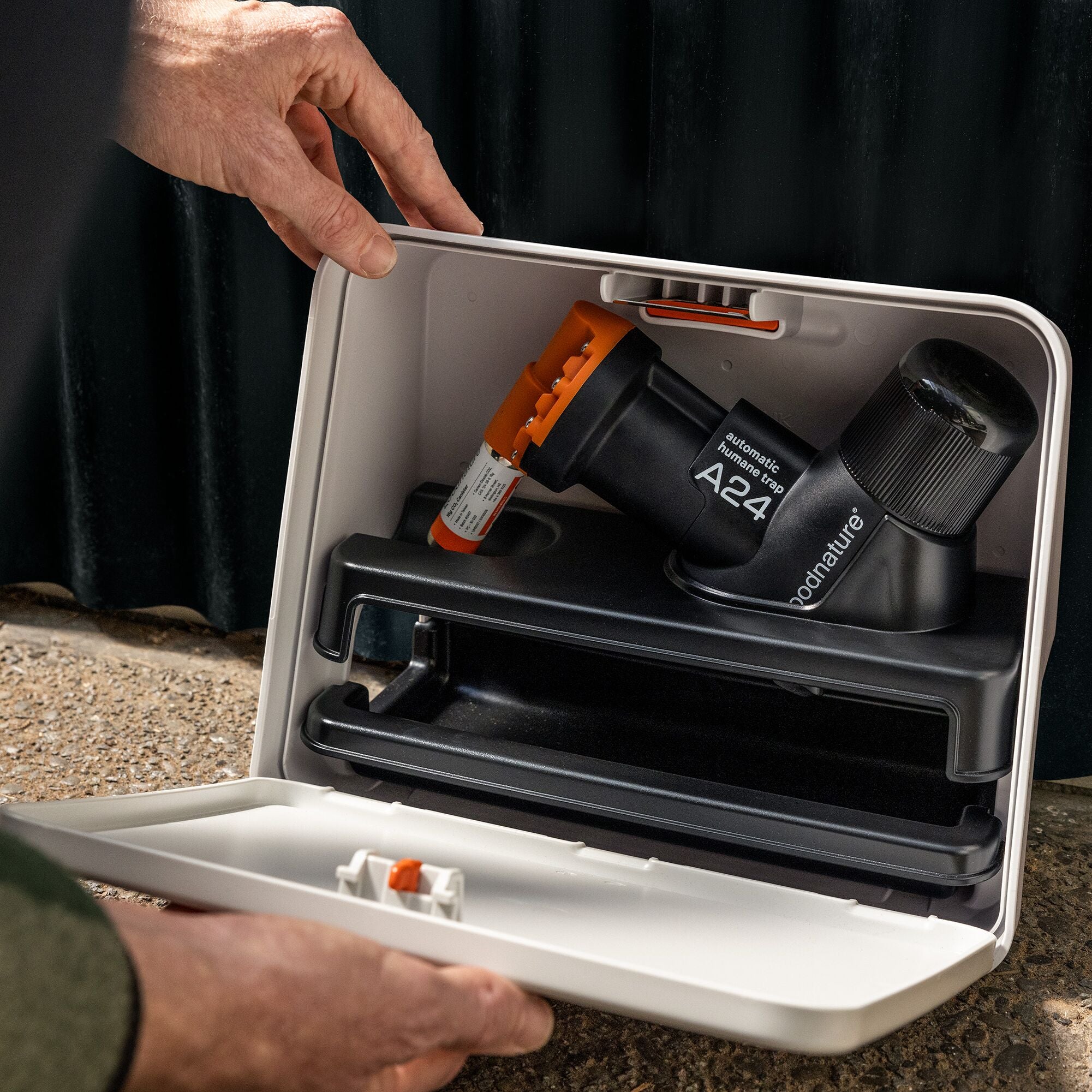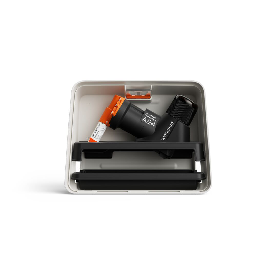 A24 fellen komplett, drives av komprimert CO2 gass. Fellen trekkes opp automatisk etter at den er utløst. GoodNature har produsert en rekke åter/lokkemiddel med lang holdbarhet. Når fellen har avlivet en gnager behøver du i utgangspunktet ikke å gjøre noe. Naturen vil gå sin gang. Den døde gnageren vil enten bli spist opp av andre dyr, eller en forråtnelsesprosess vil starte som gradvis gjør at kadaveret vil forsvinne. Ved utplassering av fellen rundt hus- eller hytte anbefales det at fellen sjekkes med jevne mellomrom for fjerning av kadaver (døde gnagere).